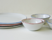 さん登場です。フチに青・赤・茶といったラインの入ったプレートと小さな入れ子のボウルが届きました。毎日の暮らしの中で活躍してくれそうな磁器の器です。